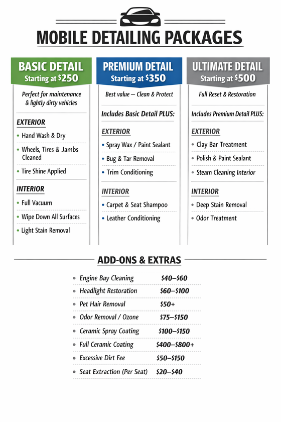 We specialize in mobile detailing and exterior cleaning services, including interior deep cleaning, exterior washes, and add-on services like stain removal and extra protection options depending on your needs.